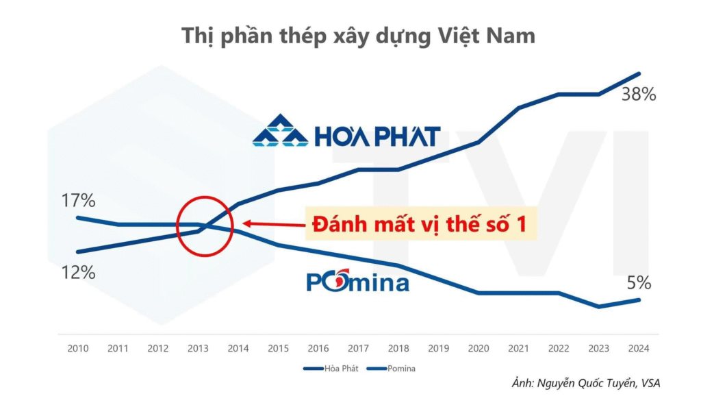 Ngày nay, khi nhắc đến thép, Hòa Phát (HPG) là cái tên thống trị với 38% thị phần. Tuy nhiên, ít ai nhớ rằng 15 năm trước, Pomina mới là “anh cả” với 17% thị phần, trong khi Hòa Phát chỉ là một “đàn em” đang tìm chỗ đứng